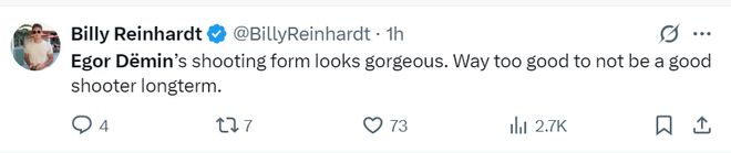 篮网记者:杰明的投篮姿势看起来美极了。长期来看必然一个出色的射手。